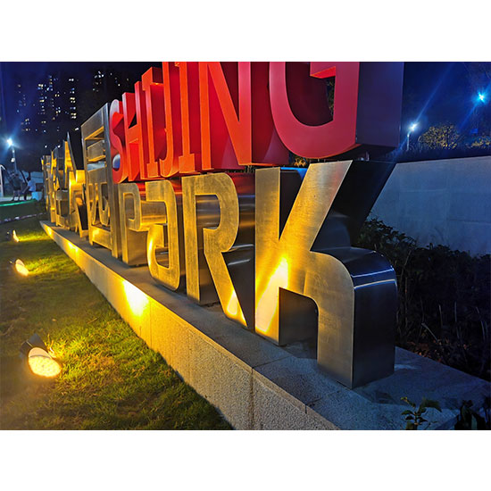 落地字,又稱景觀字,落地藝術字等,就是把字體制作成型,直接安裝在在面上、草坪上,落地字的特點是,外觀厚實、效果震撼。主要安裝于:廣場、酒店、公園、綠道、商業中心···